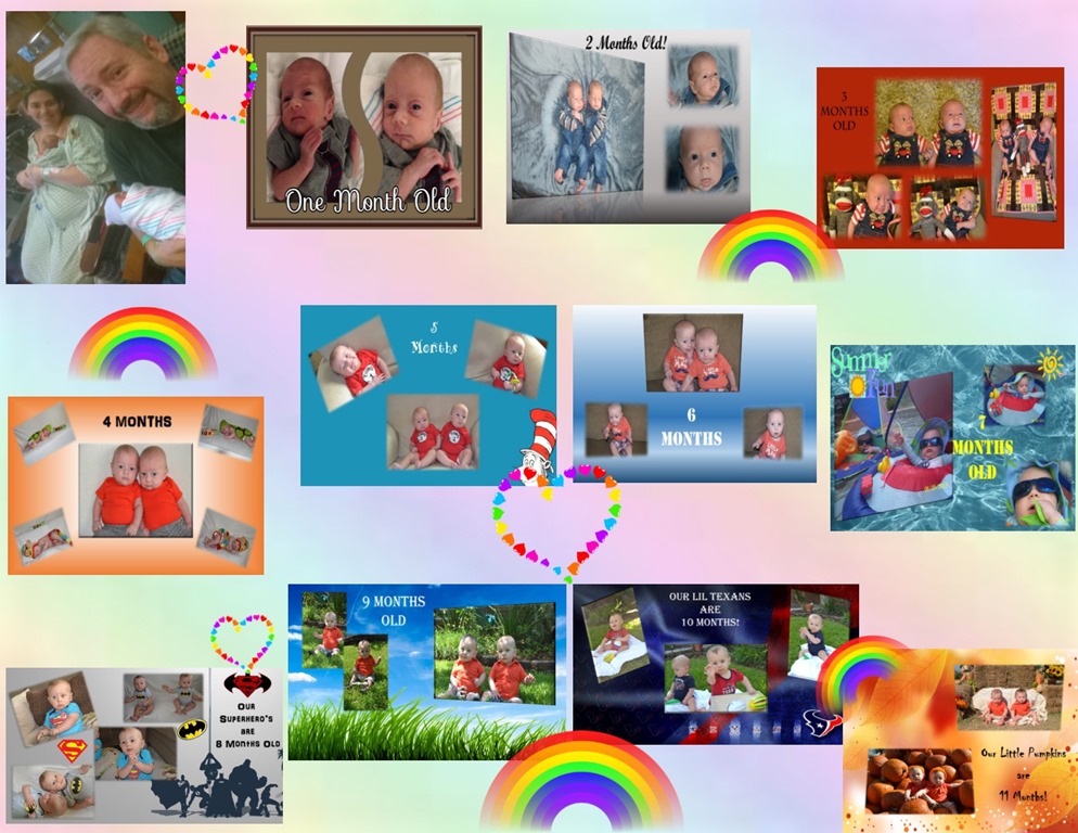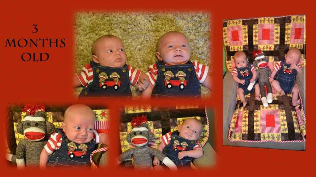 Jaxen and Owyn are rolling all over the place, sitting up and Owyn is starting to crawl. They both say momma and dada now! They are loving eating homemade baby food that I make for them. (carrots, sweet potato, butternut squash, apples, pears, chicken, cherries, yellow squash, peaches, banana, avocado, egg) We love watching them learn and discover new things each day.
