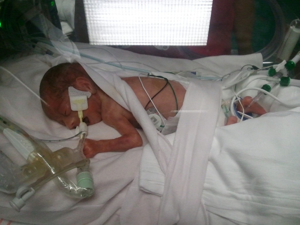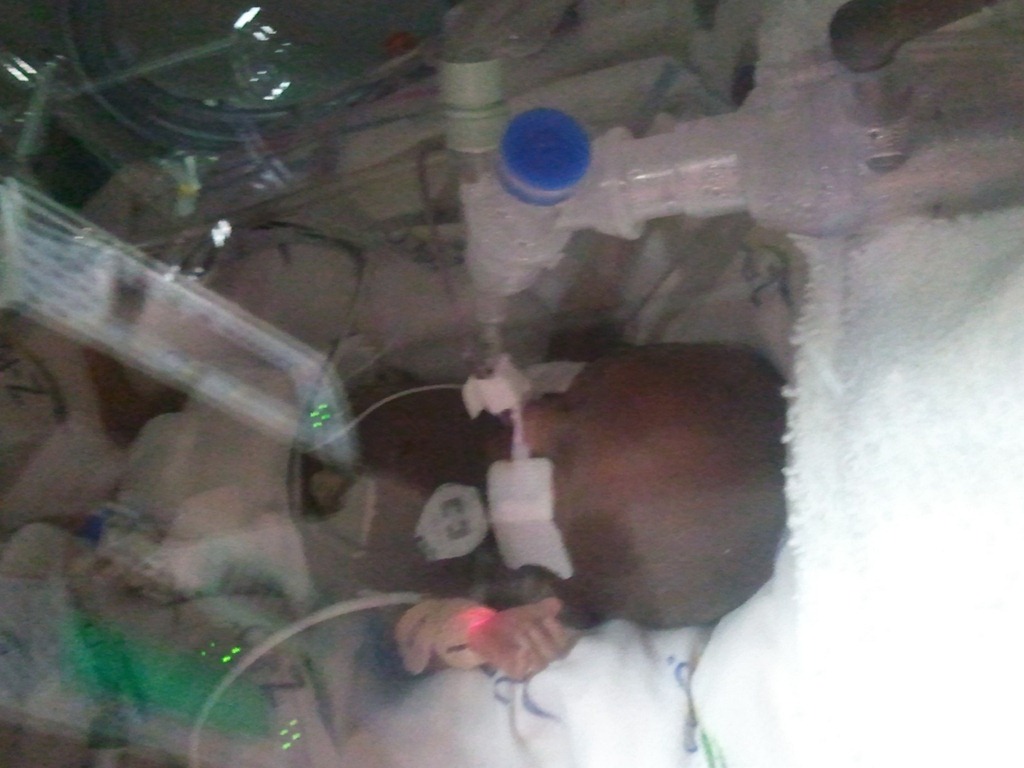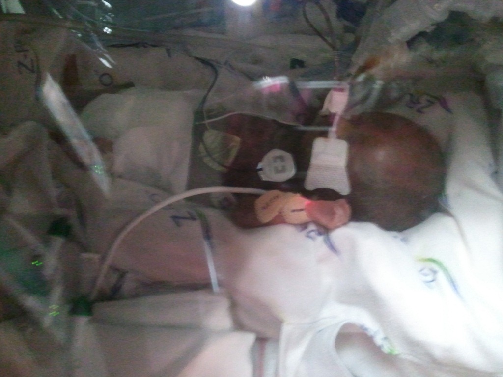 Doctors now think Nathan’s tummy discoloration is due to an infection and an operation will happen asap this morning. They will go in with a scope and remove any infected tissue from his intestinal area. They may also need to temporarily divert his intestines to an external path (colostomy) to allow the intestines to finish developing. Surgery should commence within a couple hours. Nurses just finished pricking his heel for a blood test and he has a good grip on mommy’s finger the whole time.